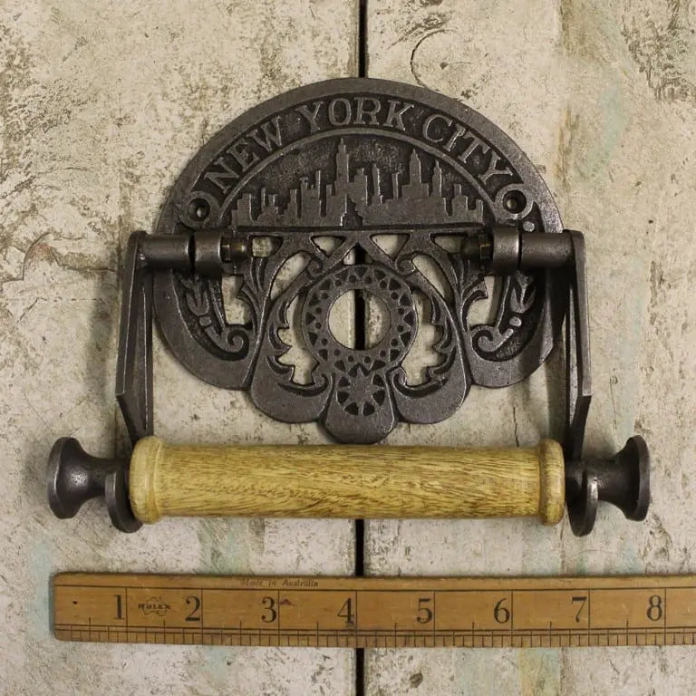 Finished in cast antique iron and wood with a protective wax, this beautifully crafted toilet roll holder adds a touch of vintage elegance and robust functionality to any bathroom decor!